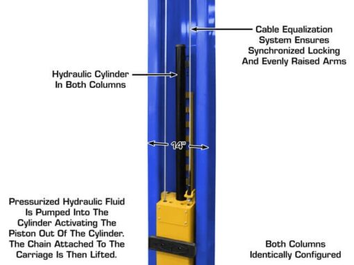 The Atlas Platinum PVL-12 is an ALI CERTIFIED overhead 12,000 lbs. capacity two post lift designed to accommodate both long wheel base trucks and passenger cars. The distance between the symmetrical columns is almost 123″ with a drive through space of over 108″. The extra distance between the symmetrical columns will allow the widest of vehicles to be lifted.